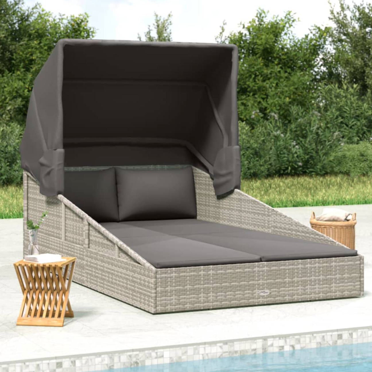 Dit ligbed met inklapbaar dak is de ideale metgezel voor je vrije tijd en vakantie om in je tuin of bij het zwembad te ontspannen en te genieten.